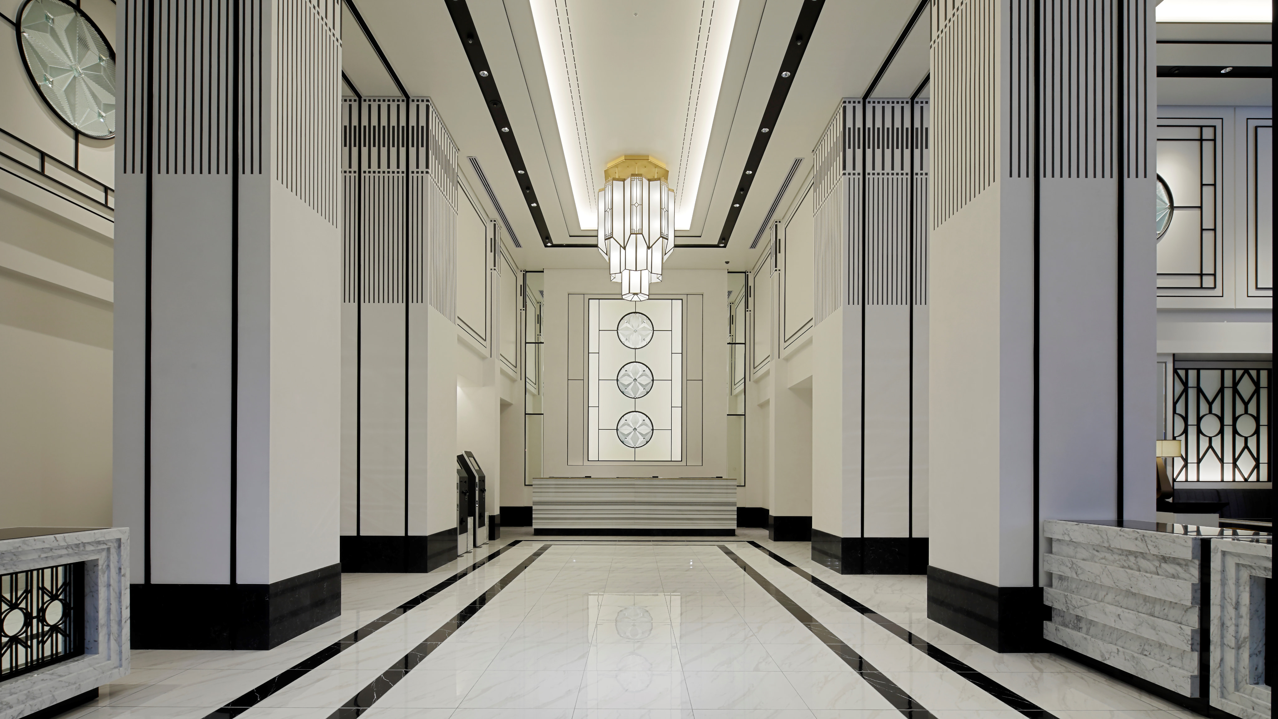 入った瞬間、モノトーンで統一された広いロビーが正面に見えます。